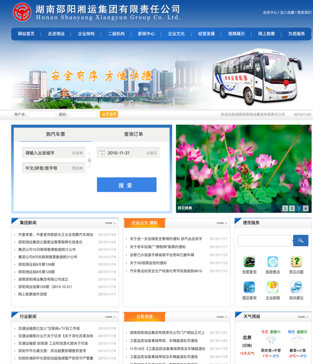 為加強(qiáng)企業(yè)信息化工作,利用網(wǎng)站推廣企業(yè)文化、提升內(nèi)部管理效率,湖南邵陽湘運(yùn)集團(tuán)有限責(zé)任公司官方網(wǎng)站域名m.xu321.com于11月11日通過審核,網(wǎng)站次日正式上線發(fā)布。集團(tuán)公司與旗下客運(yùn)子公司均有獨(dú)立版面,可發(fā)布文件信息、動(dòng)態(tài)新聞等,今后集團(tuán)公司的公文、通知等將在網(wǎng)上發(fā)布,各子公司在網(wǎng)上查看下載,極大提升了文件發(fā)布的效率。該網(wǎng)站最大的特點(diǎn)是可以查詢邵陽地區(qū)一二級(jí)車站所有車輛班次、時(shí)間、價(jià)格信息,并可在線購(gòu)票,購(gòu)票成功后憑密碼或身份證前往車站自動(dòng)取票機(jī)(或人工售票窗口)取票,該網(wǎng)站為旅客提供了一個(gè)便捷的購(gòu)票渠道。