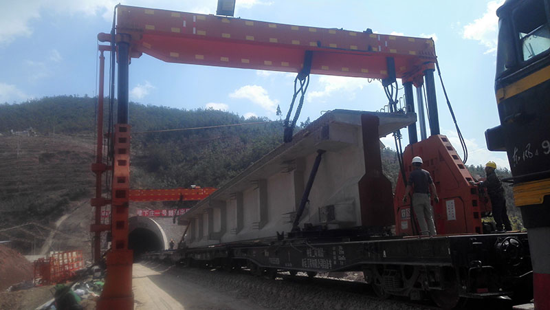 雙線倒裝龍門架是一種跨雙線的梁片或軌排的倒裝龍門架,它可在平車和炮車之間通過橫移方式實現(xiàn)梁片或軌排的吊裝。既適用于雙線倒裝,也適用于單線倒裝。支起時內(nèi)部空間可通過機車。運輸時滿足限界要求。倒裝龍門架主要由增高節(jié)、底架總成、柴油發(fā)電機、液壓系統(tǒng)、電控系統(tǒng)、導向柱組成、升降機構、護架組成、起重梁、橫移機構、吊繩裝置、油缸總成等部分組成。